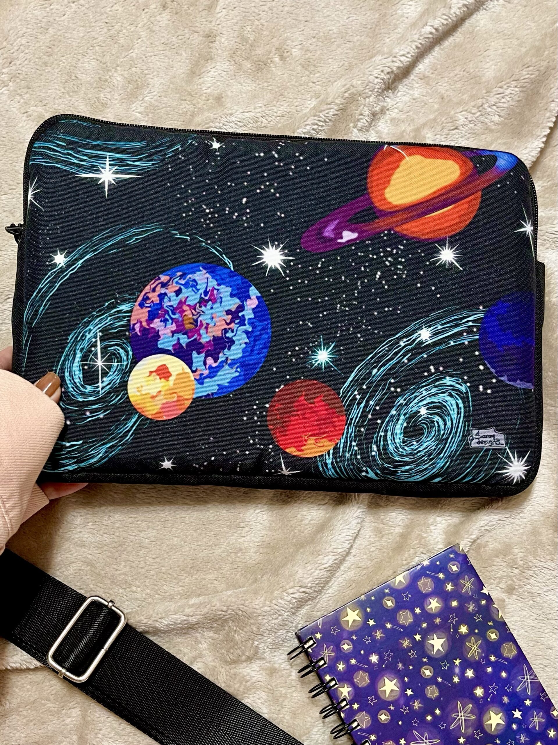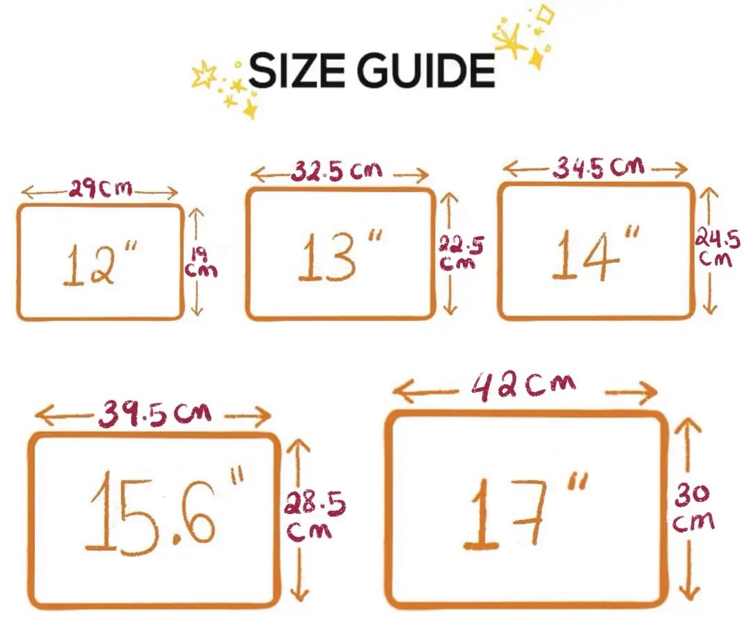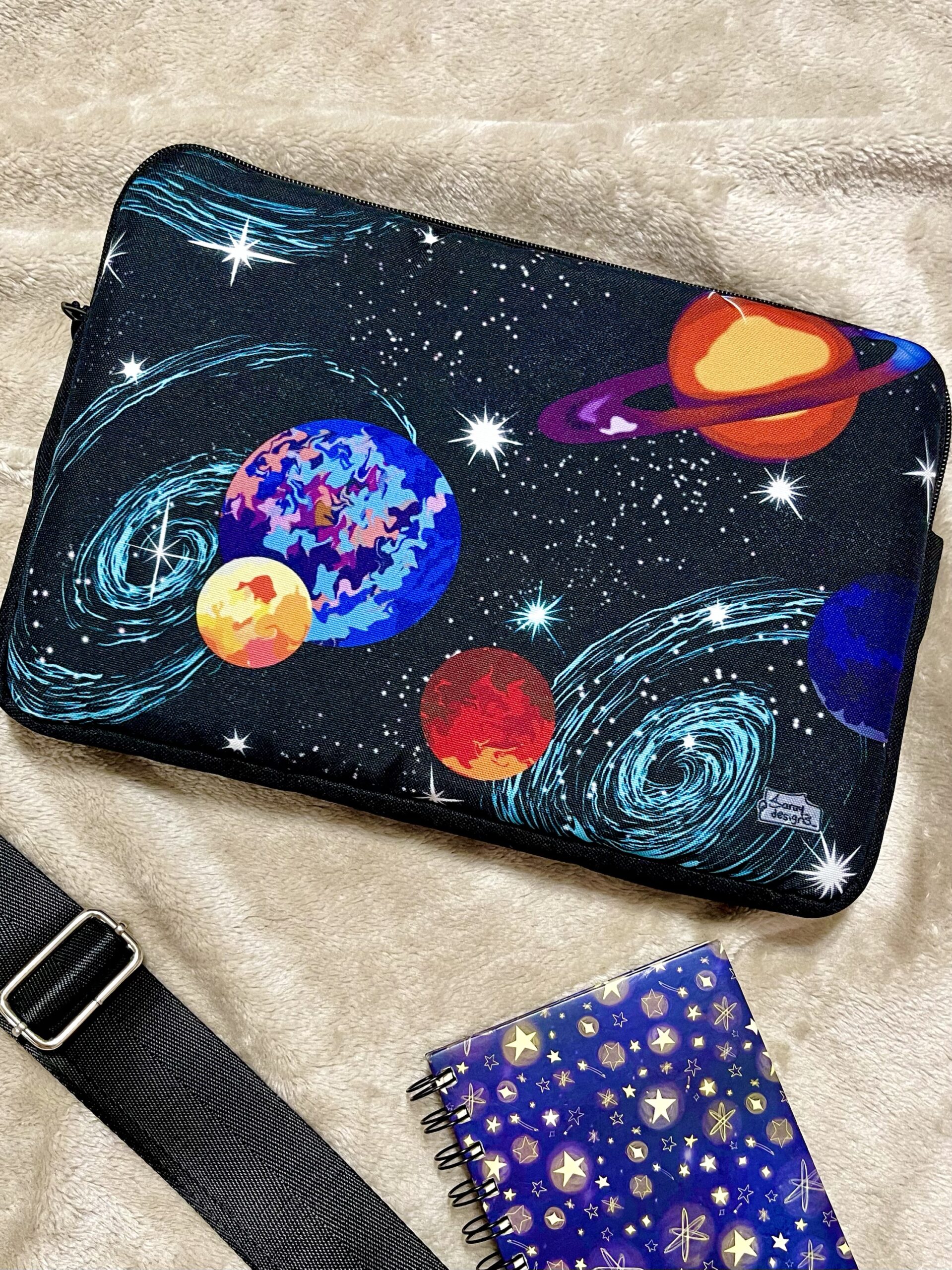 Waterproof fabric, Front and back print, Single black zipper, High quality polyester fabric that can withstand wear and tear, Foam padding for protection from inside, Velvet lining to prevent scratches of the laptop, Detachable strap that extends to 135 cm, No washing, only dry cleaning or wet wipes care