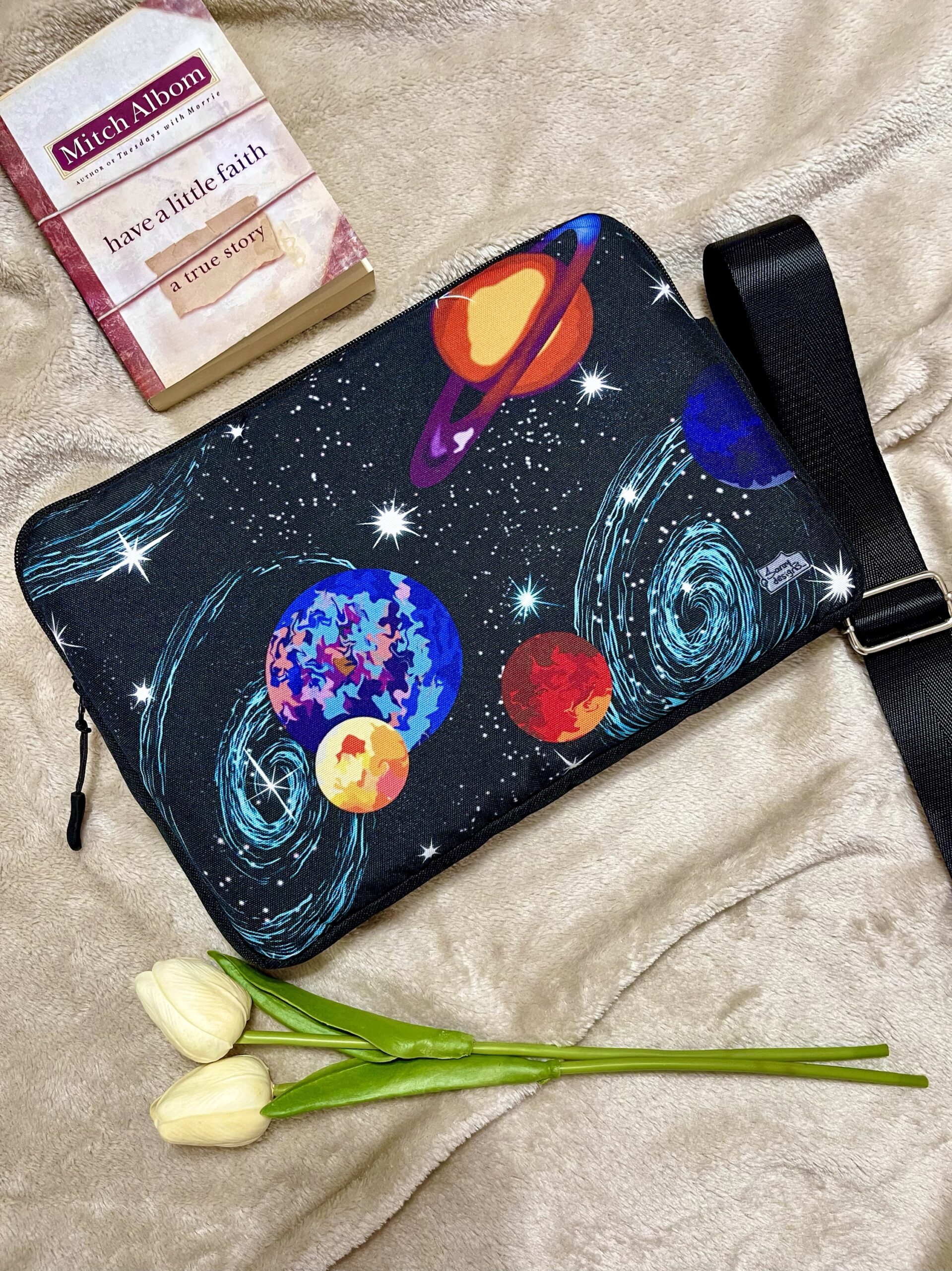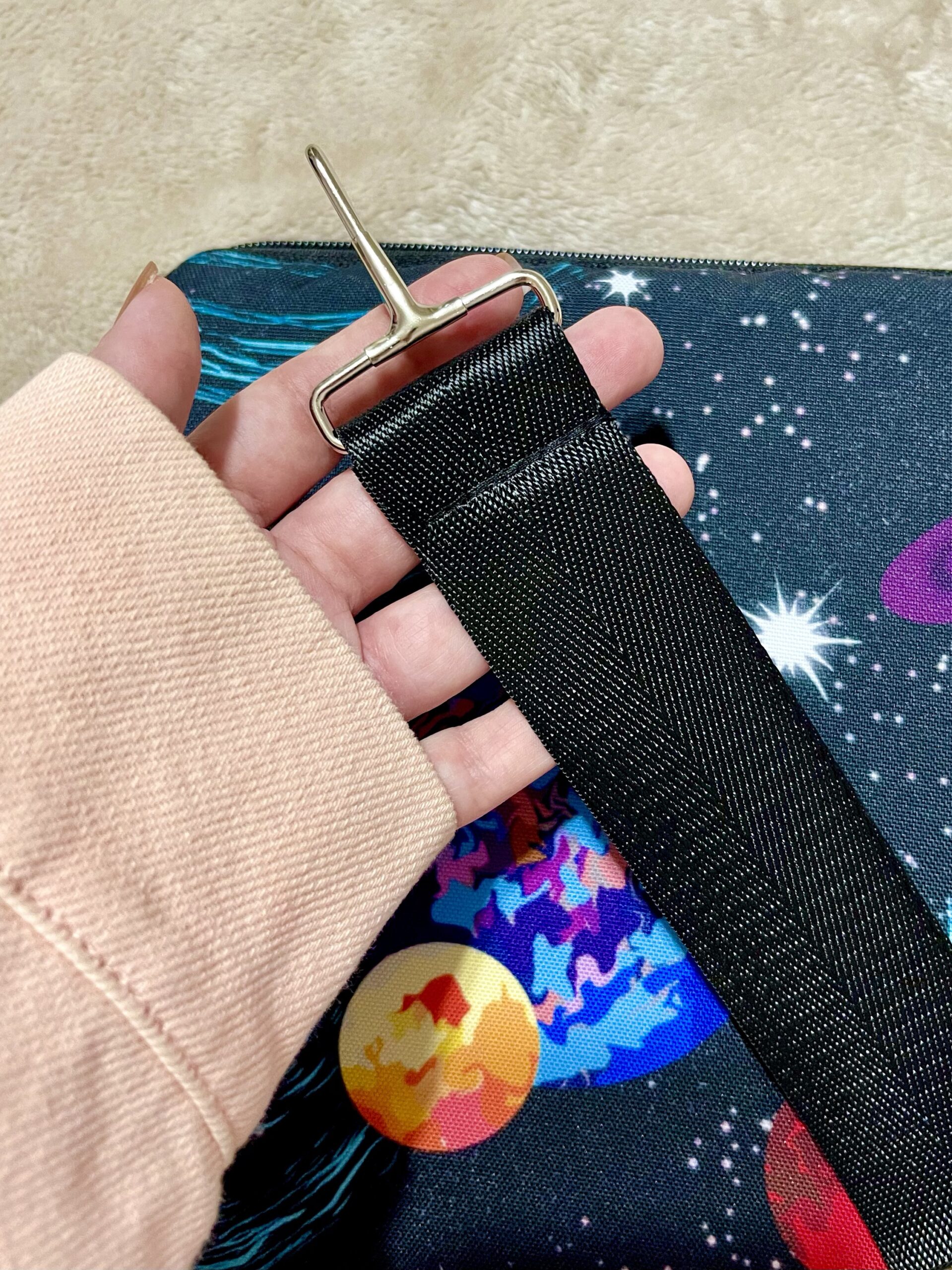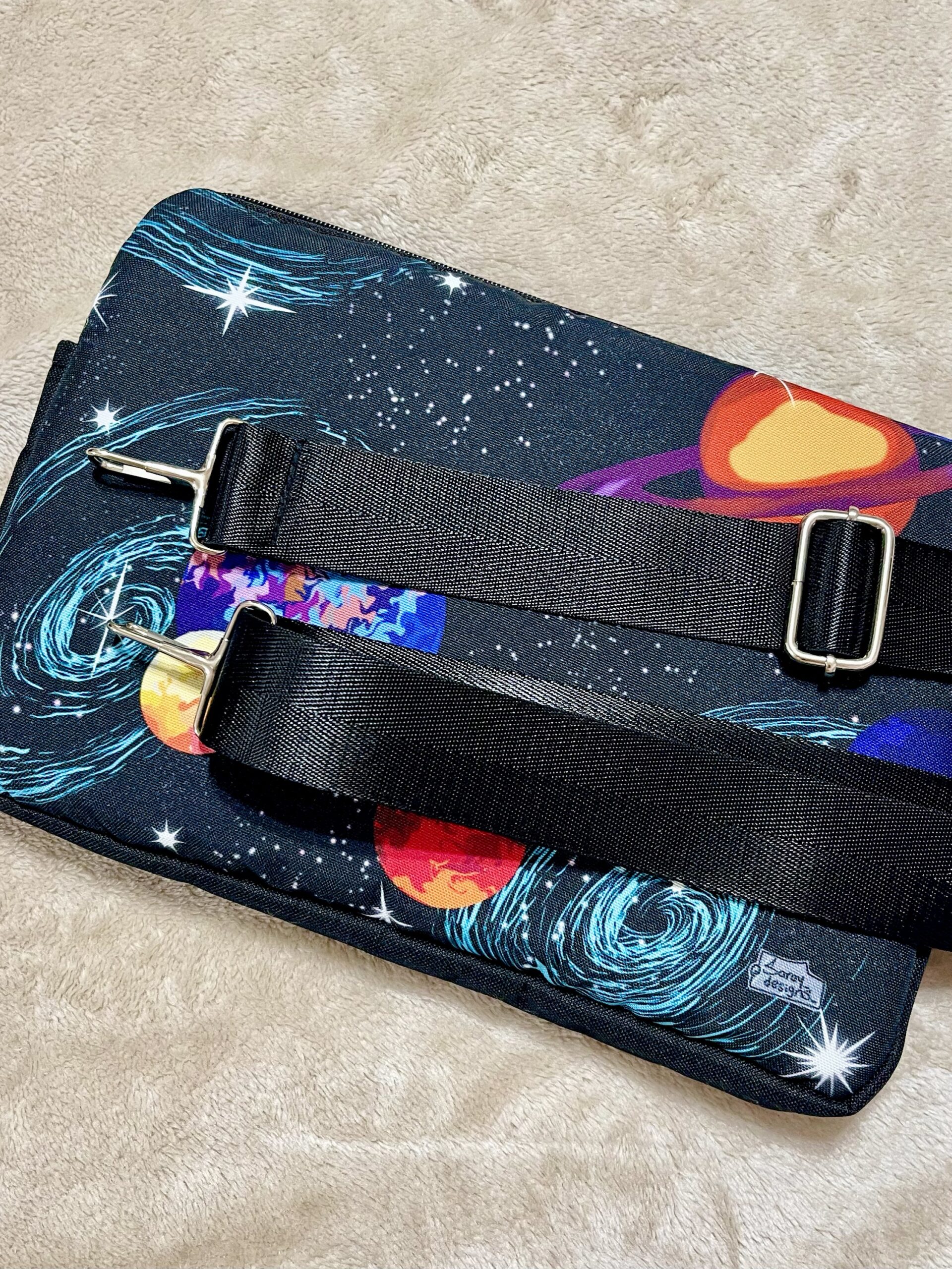 Waterproof fabric, Front and back print, Single black zipper, High quality polyester fabric that can withstand wear and tear, Foam padding for protection from inside, Velvet lining to prevent scratches of the laptop, Detachable strap that extends to 135 cm, No washing, only dry cleaning or wet wipes care